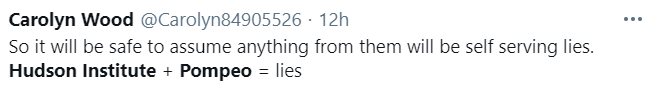 “可以肯定的是,他们说的一切内容都是自私的谎言。哈德逊研究所+蓬佩奥=谎言”。