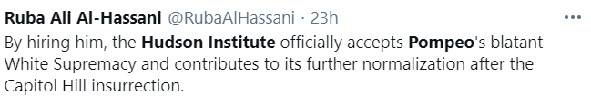 “雇用了他(蓬佩奥),哈德逊研究所就算正式接受了蓬佩奥那套赤裸裸的‘白人至上’主义,并企图在国会大厦暴乱后将其正常化。”