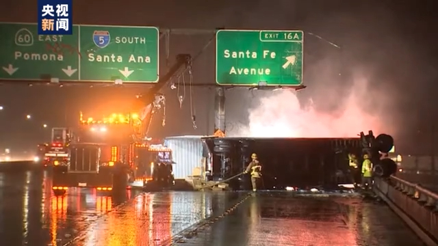 当地时间29日,受大雨影响,洛杉矶地区一条州际高速公路发生一起大型货车翻车事故,部分车体冒烟,消防员已经赶往现场进行紧急处理,司机已成功脱困。