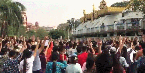 在缅甸最大城市仰光,抗议者情绪高涨,有人伸出三指敬礼,在街头高喊着“军事独裁者失败”的口号,并高举“反对军事独裁”的横幅或昂山素季的照片。有抗议者驾车前往仰光街头鸣笛。