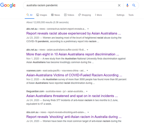 然而,事实对澳方却颇为打脸。实际上,当耿直哥只是简单地在谷歌英文搜索引擎上输入了“澳大利亚”、“种族主义”和“疫情”这三个关键词后,便看到了大量与澳大利亚政府的说法截然相反的报道,而且这些报道不仅都是近半年内的,更来自于澳大利亚本国的媒体及其他英美媒体。