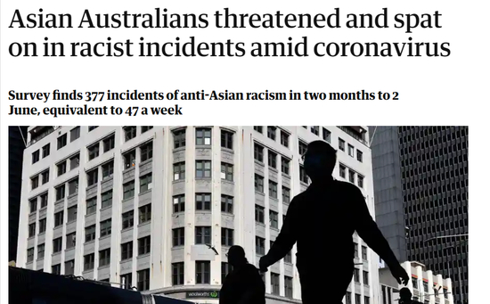 而同样报道了该报告的英国《卫报》则更加直接地在报道中给出了其中一个让人确实很震惊的数据:去年4月到6月这短短两个月里,澳大利亚的亚裔民众上报了377起种族歧视事件,这相当于每周就会发生47起……