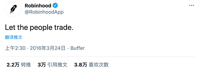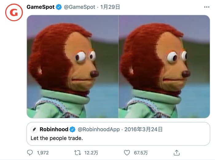 随后,盈透(Interactive Brokers)、德美利(TD AmeriTrade)等美国龙头券商也相继推出限制股票交易等措施。游戏驿站股价随即从最高的每股483美元,一路被抛售至最低每股112.25美元。而游戏驿站也只能翻出“罗宾汉平台”在2016年发布的一条鼓励自由交易的推特,并配上一幅难以置信的表情。