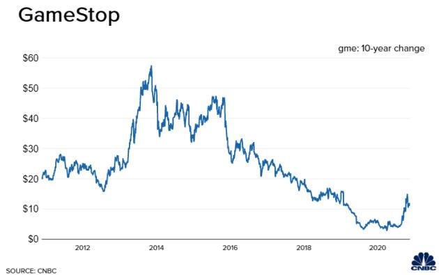 然而,随着互联网和电子商务的发展,游戏驿站受到电子游戏数字化和云平台等多重打击。到2020年上半年,游戏驿站的股价已从2016年的二三十美元跌至不到3美元。