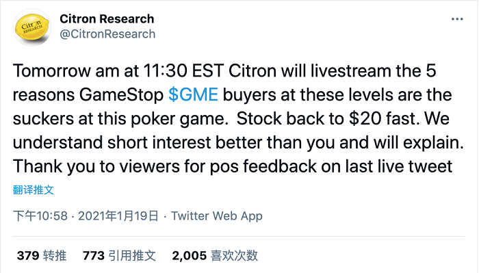 1月19日,华尔街知名做空机构香橼对游戏驿站发表看空评论,认为游戏驿站最多只值20美元。