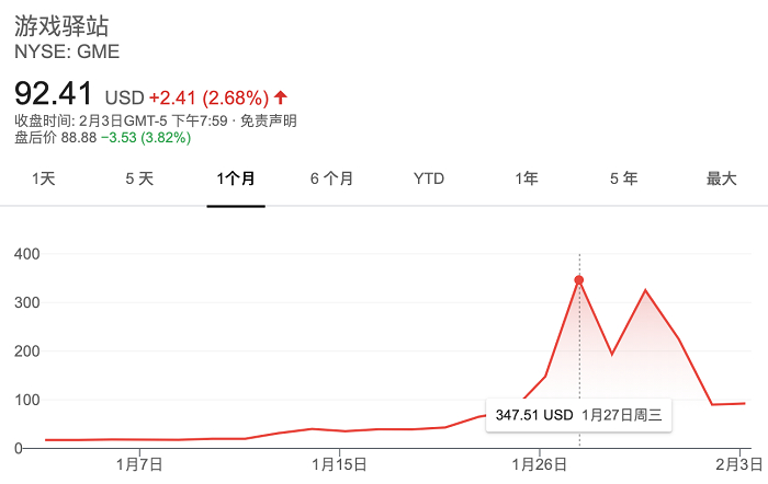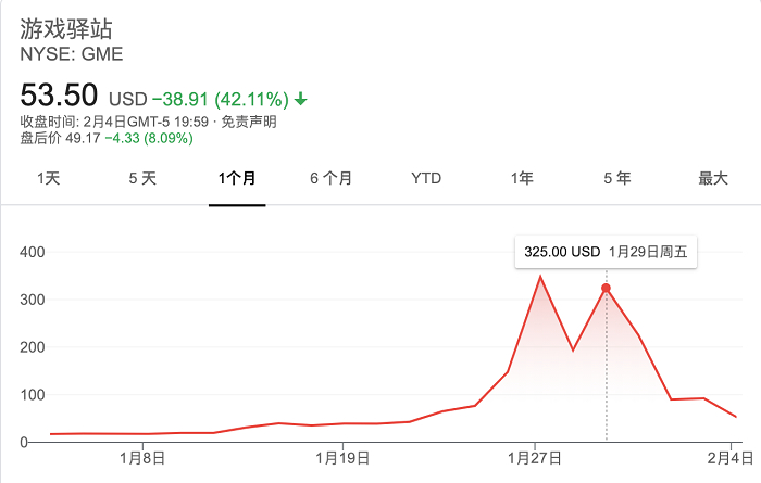 2月4日,美股收盘之后,游戏驿站的股价只有53.5美元,比前一天暴跌了42%。最近的这一周之内,游戏驿站已经累计暴跌超80%,与1月份创下的最高纪录下跌了近90%,而参与这次大战的美国散户很多都是高位进场的。