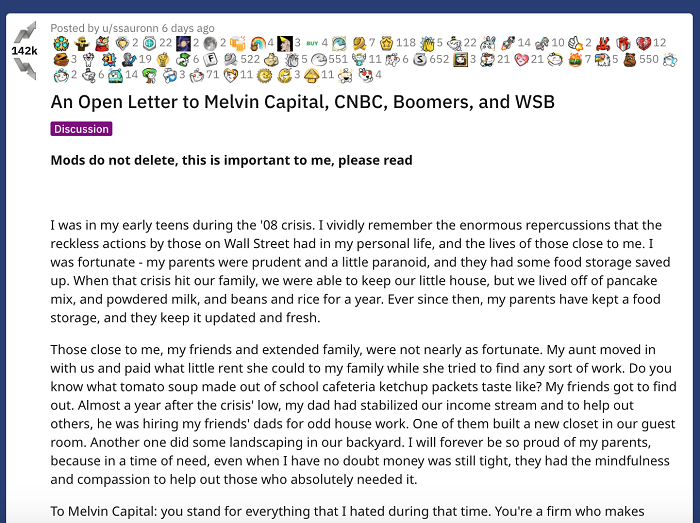 还有一名网名为索伦的用户在WSB论坛发布长文,陈述自己加入反抗“华尔街之狼”大军的理由:“在我十几岁时经历了2008年金融危机。我至今清晰地记得,华尔街(空头)不计后果的行为给我和我身边的人带来的巨大变故。很幸运,我的父母囤积了一些食物,那场危机席卷而来时,我们保住了家里的小房子,我们仅靠着煎饼、奶粉、豆类和米饭度过了整整一年。”