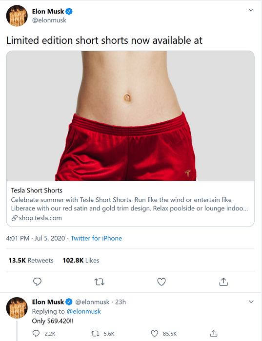 2020年7月,马斯克在推特上发布了一款红色做空短裤(short shorts),讽刺做空特斯拉的空头们输得只剩下裤衩。