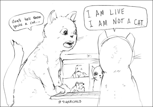 “我,我不知道该怎么关掉它……我在这现场直播,我不是一只猫。”
