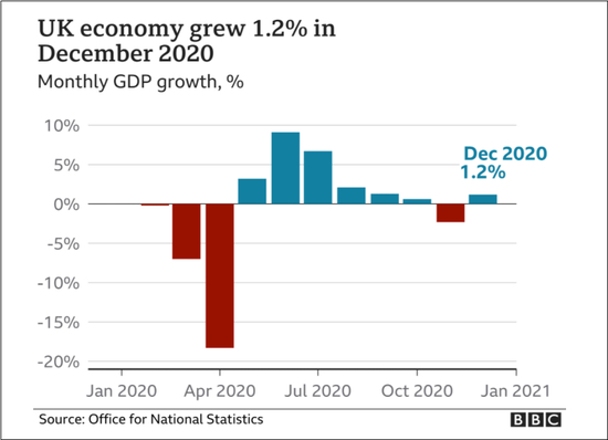由于新冠疫情在去年末死灰复燃,英国重新实施了全国封锁措施,因而去年第四季度英国国内生产总值(GDP)环比仅增长1%。