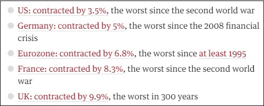 这创下了英国311年来的最大经济跌幅。上一次让英国经济受这等重创的还要追溯到1709年的全欧“大霜冻”,彼时的英国还是个农业国,连工业革命都还没发生。
