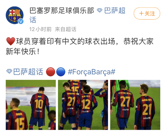 在推特上,该俱乐部不仅放出球员身着印有中文名字的球衣登场的视频,还送上了新春祝福。该推文不仅用简体字和繁体字写下祝福:“巴萨贺新春,牛年行大运!”推文还写道,“春节快乐!巴萨球员穿着印有他们中文名字的球衣是为了庆祝这一节日。”↓