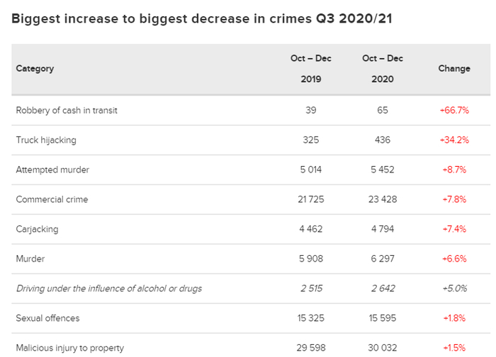 根据南非警方统计,2020年10月到12月期间南非发生犯罪案件459518起,相比2020年6月到9月期间发生的394398起案件,犯罪率增加了16.5%。但是较2019年同期相比,犯罪率减少了9.1%。虽然犯罪率有所下降,但是谋杀案增加了6.6%,2020年10月到12月期间共有6283人因暴力犯罪死亡,相当于每20分钟有一人因暴力犯罪死亡。