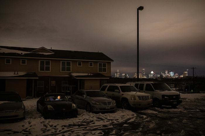 当地时间2021年2月16日,美国得州奥斯汀市,街道上一片漆黑,民众在车内取暖并为手机充电。