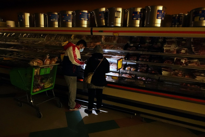 当地时间2021年2月16日,美国得州达拉斯市,民众在漆黑的超市内,借助手机灯光查看肉类柜台。