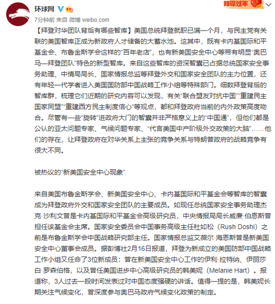 来自美国布鲁金斯学会、新美国安全中心、卡内基国际和平基金会等智库的智囊成为拜登政府外交和国家安全团队的主要成员。如现任总统国家安全事务助理杰克·沙利文曾是卡内基国际和平基金会高级研究员,中央情报局局长威廉·伯恩斯曾担任该基金会主席。国家安全委员会中国事务高级主任杜如松(Rush Doshi)之前是布鲁金斯学会中国战略研究部主任。国家情报总监艾薇尔·海恩斯曾是新美国安全中心董事会成员。据彭博社2月16日报道,拜登为新成立的美国防部中国战略工作小组又任命了3位新成员:曾在新美国安全中心工作的伊利·拉特纳、伊丽莎白·罗森伯格,以及曾任美国进步中心高级研究员的韩美妮(Melanie Hart)。报道称,3人过去一段时间发表过对中国态度强硬的讲话。值得一提的是,韩美妮长期关注气候变化,曾深度参与奥巴马政府气候变化政策的制定。