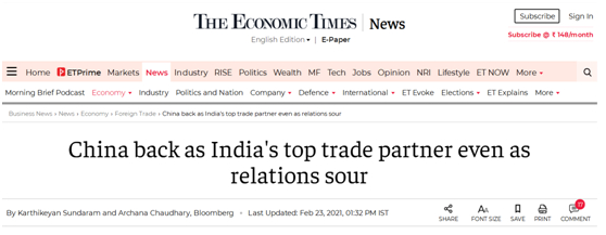 彭博社23日引用印度商工部的数据报道说,2020年,中印这两个长期经济和战略竞争对手之间的双边贸易额为777亿美元。尽管低于前一年的855亿美元,但足以使中国取代美国成为印度最大贸易伙伴。而同期,印度与美国的贸易额萎缩到了759亿美元。