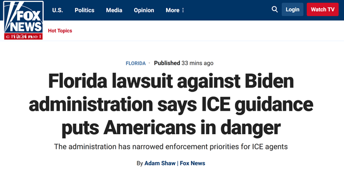 [环球网报道 实习记者 杨英琦]综合美联社和福克斯新闻报道,美国佛罗里达州当地时间9日因一项新指令起诉拜登政府,原因是该指令缩小了逮捕和驱逐非法移民的范围。这一新诉讼出现之际,美国已有多州因其他行政令问题起诉拜登政府。