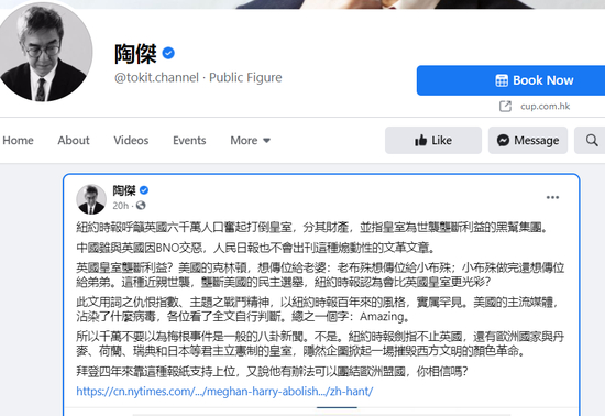 如下图所示,对英国殖民时代颇为怀念和推崇的香港“公知”陶杰,昨天就在他的个人社交账号上怒斥了诺兰的这篇文章,称此文在煽动“仇视”英国乃至全欧洲的皇室贵族,还用一种“比烂”的口吻攻击起了美国的“民主选举”制度,称美国那种“近亲世袭”和“垄断”的制度并不比英国王室光彩。