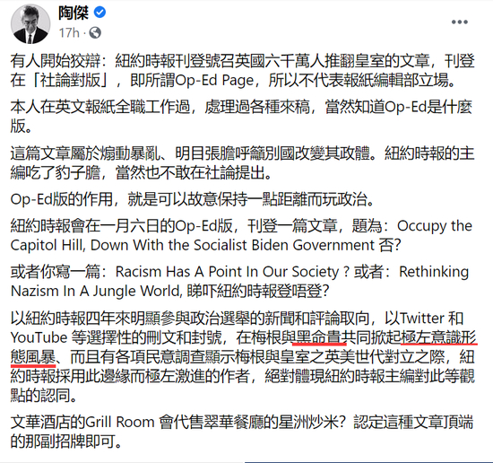 更逗的是,在有人告诉陶杰那篇要求废除英国君主制的文章不代表《纽约时报》立场,只是一篇独立评论文章时,陶杰仍坚持认为那就是《纽约时报》的立场,并继续指控该报是在“煽动暴乱、明目张胆呼吁别国改变其政体”。