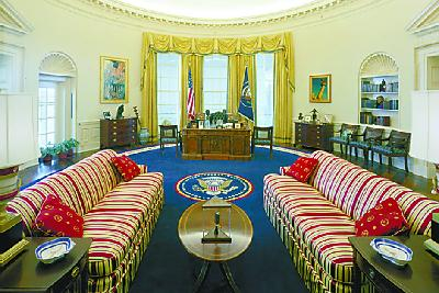 这间椭圆形办公室作为影响历史进程的诸多决议诞生之地,自然需要用相应的装饰来匹配,从办公室地毯,到维多利亚女王送给卢瑟福·海斯总统的礼物——“坚决办公桌”以及室内摆放的饰品,墙上的挂画,甚至一句名言,一个小小的徽标,都体现着白宫主人的格调。