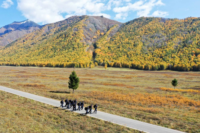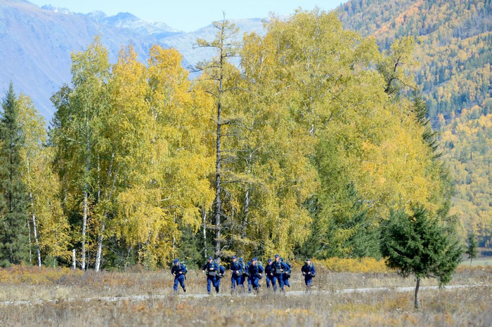↑新疆喀纳斯景区——阿勒泰地区森林消防支队禾木驻防分队队员进行负重越野训练,加大防火执勤力度,确保重点林区防火安全。