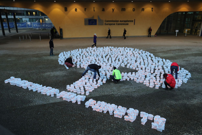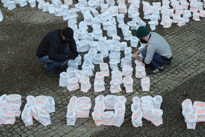 ↑比利时布鲁塞尔——环保人士用装有蜡烛的纸袋摆成树木的形状,呼吁人们保护森林。