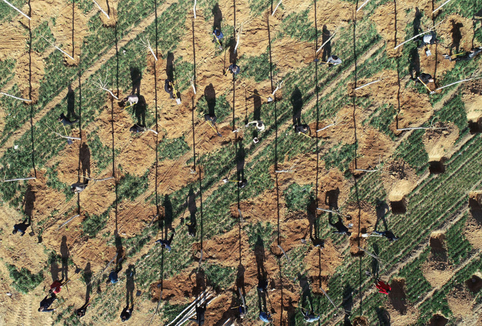 ↑志愿者在河北省武安市伯延镇伯延村植树