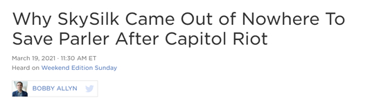 比如在亚马逊公司因Parler平台涉嫌煽动了1月6日美国国会大厦暴乱而将其“断网”,不再给这家右翼社交平台提供网站托管服务后,一家名不见经传的右翼IT公司SkySilk前些天就站了出来,重新给Parler提供了网站托管服务。