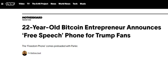 于是,一位通过搞比特币而发家的美国22岁企业家兼“爱国”青年,便想出了一个极为“睿智”的办法:开发一台能给予美国“爱国者”真正“言论自由”的“自由手机”,去对抗美国大企业对他们这些“爱国人士”的言论封锁。