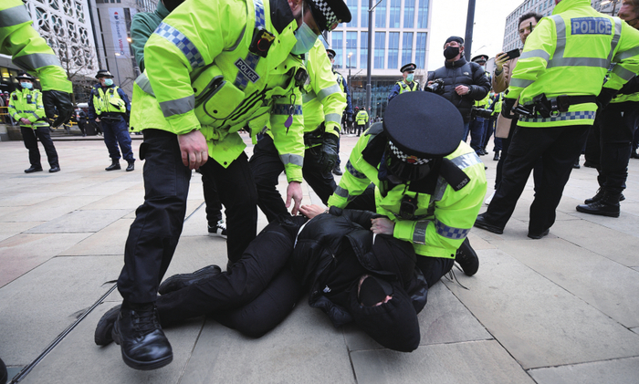 当地时间27日,曼彻斯特警方逮捕一名示威者。