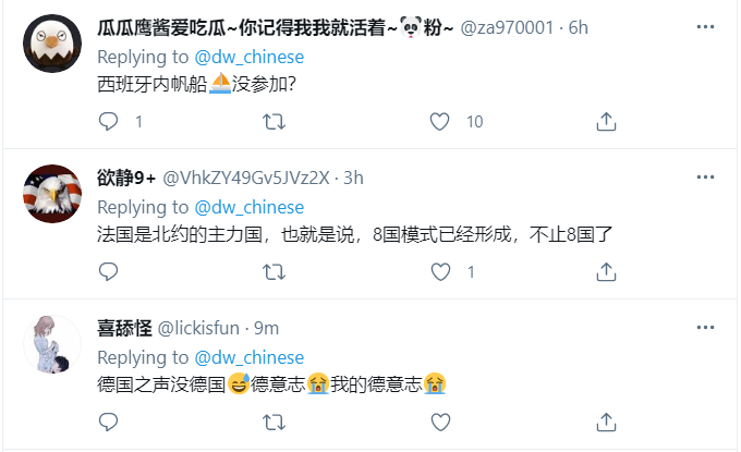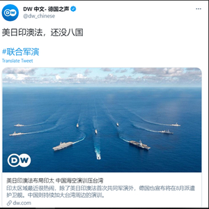 在转发导语中,《德国之声》中文网的编辑写道:“美日印澳法,还没八国”。考虑到这则新闻有关的军事演习具有明确的“针对中国”的含义,因此,这里所谓的“八国”,很可能是在联系“八国联军侵华”的历史。