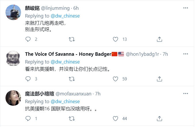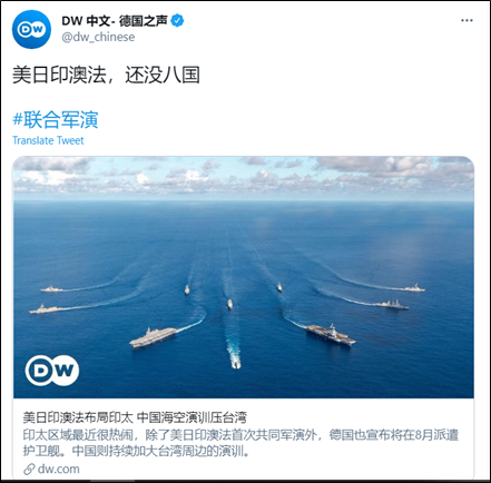 4月6日,《德国之声》中文网刊登了一篇有关多国海军在印太地区进行联合军演的新闻,并在新闻中明确提到本次演习是为了“制衡中国在该地区的野心”。但在转发这则报道时,《德国之声》中文推特却用了这样一个饱含历史暗喻的导语。