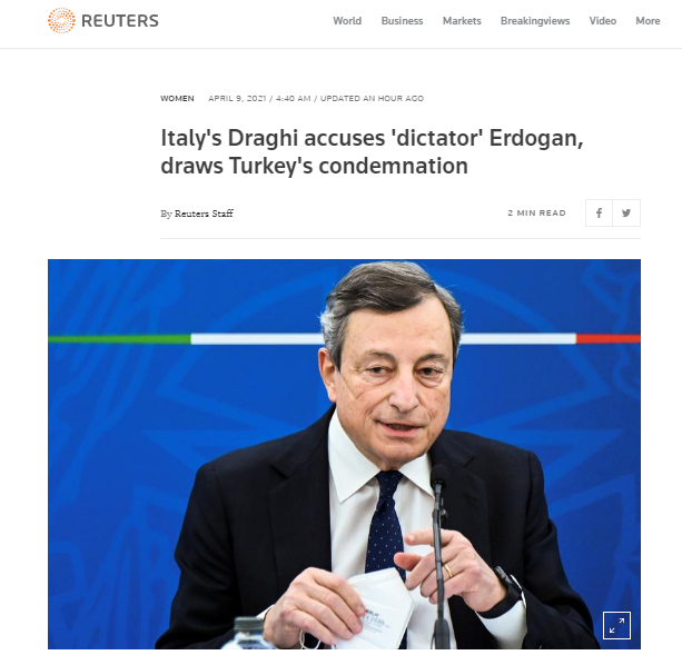 【环球网报道 记者 张晓雅】因一把椅子引发的外交风波持续发酵。英国路透社报道称,意大利总理德拉吉8日谈及土耳其总统埃尔多安日前会见欧盟两位高官时没有给欧盟委员会主席冯德莱恩准备同类座椅一幕,指责埃尔多安是在“羞辱”冯德莱恩,还称土耳其一些人为“独裁者”;意总理言论也引发土方不满,土耳其外交部不仅召见了意大利大使,土外长也公开发声谴责有关言论。