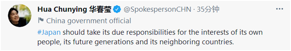 在第三条推文中,华春莹继续说,“日本该对其本国人民、子孙后代以及周边国家的利益承担应有的责任。”