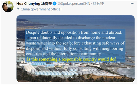 华春莹连发三推反问日本核废水排放决定:“这是一个负责任的国家会做的事吗?”