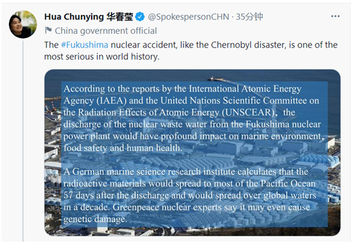 华春莹刚刚发推说,“像切尔诺贝利灾难一样,福岛核事故也是世界历史上最严重的核事故之一。”↓