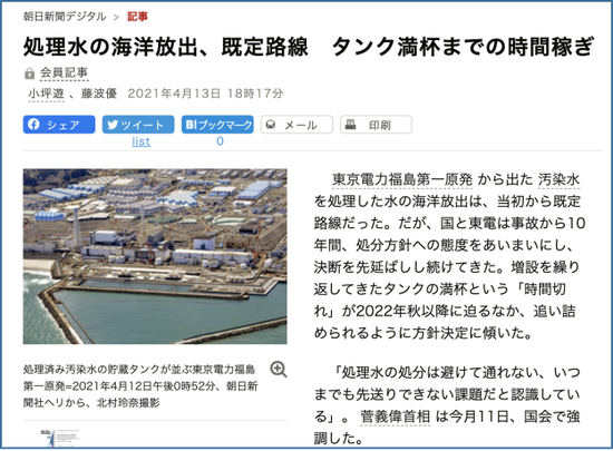 将处理过的水释放到海洋中,朝日新闻报道截图