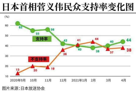 (图说:日本首相菅义伟自上任以来的民调支持率变化图。日本放送协会于4月9日至11日进行的民调显示,“支持”菅义伟的人为44%。4月9日,日本政府表示,“基本决定”将福岛第一核电站核污水排入大海。)