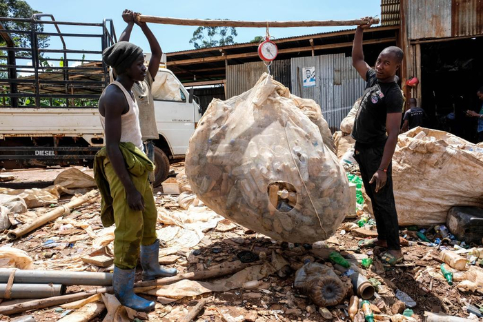 3月24日,在位于乌干达首都坎帕拉郊区恩萨比亚的“乌干达生态方式”废旧塑料回收中心,工人们在给塑料瓶称重。新华社发(纳瓦达 摄)