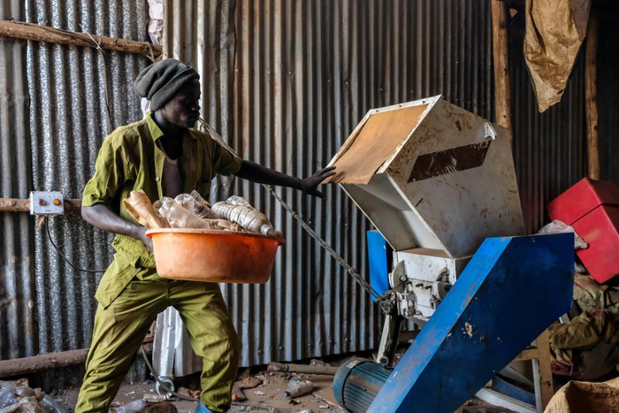 3月24日,在位于乌干达首都坎帕拉郊区恩萨比亚的“乌干达生态方式”废旧塑料回收中心,一名工人准备将回收的塑料瓶放入破碎机中。新华社发(纳瓦达 摄)