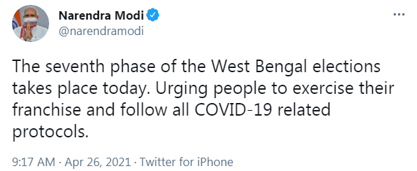 当地时间4月26日,莫迪发推称:“西孟加拉邦选举的第七阶段于今天举行。(我)呼吁民众行使他们的公民权力,并遵守所有与新冠疫情相关的规定。”