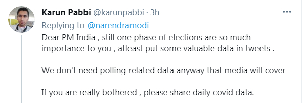 也有网友苦口婆心地劝道:”亲爱的印度总理,(即便)一个阶段的选举对你们来说非常重要,(但)至少在推特上也发一些有价值的数据吧。无论如何,我们不需要民调相关数据,媒体会报道的。如果你真的在意,请分享每天的新冠数据。”