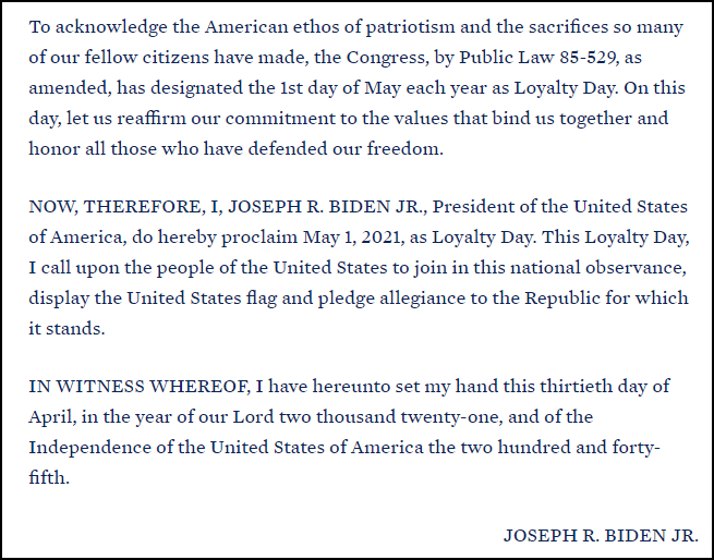 拜登宣布,2021年的五月一日为忠诚日。拜登呼吁民众在这一天“加入这个法定节日,挂美国国旗,并对这个节日所代表的国家宣誓效忠。”