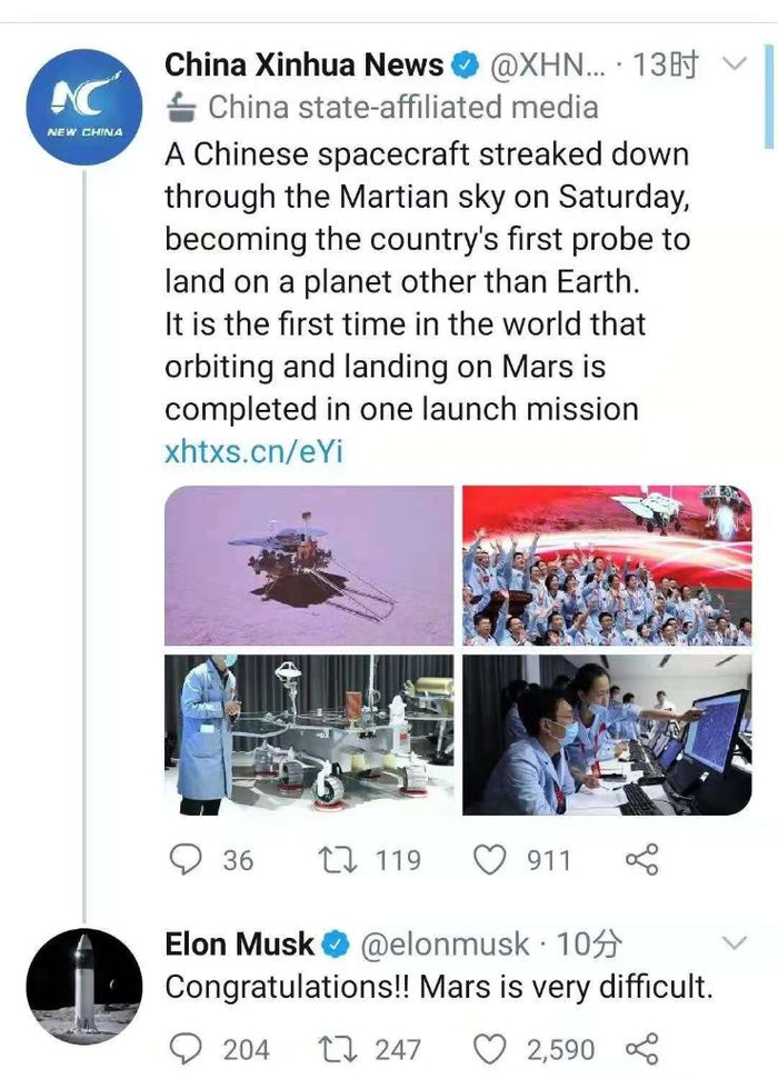 在新华社海外社交媒体报道页面,美国太空探索技术公司创始人埃隆·马斯克留言:“祝贺!!去火星是非常困难的。”(记者:张晓茹、鲁金博、陈晨、于涛;编辑:罗国芳、栾海、冯玉婧、刘军、唐志强)