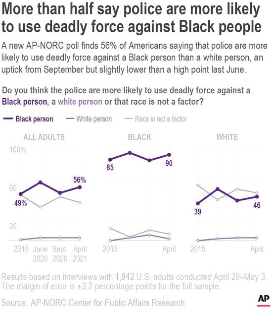 美联社与芝加哥大学公共事务研究中心(AP-NORC)21日公布的最新民调显示,过半数受访者认为,相较于白人,美国警察更容易对非洲裔美国人采取致命性的暴力手段。