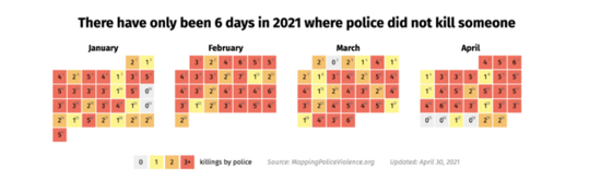 美国民间研究组织“警察暴力地图”(Mapping Police Violence)公布的数据显示,2013年到2020年间,美国每年都有1100人左右死于警察暴力执法;而今年前四个月,美国仅有6天没有发生警察暴力执法致死事件。