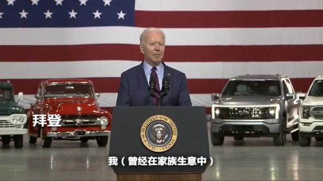 2021年5月18日,美国总统拜登小跑着来到密歇根州福特工厂的展示台前。