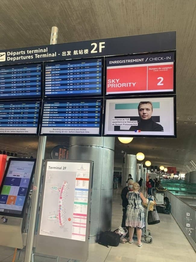 社交网站上有人发出了在巴黎夏尔·戴高乐机场的照片,在候机厅中贴出了此次被捕的普罗塔谢维奇照片,并要求释放他。据法新社27日报道,七国集团当天敦促白俄罗斯“立即无条件”释放普罗塔谢维奇。继周一的“领空禁令”后,欧盟威胁对白俄罗斯实施更多的经济制裁。