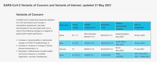 据世卫组织官网消息,截至5月31日,世卫组织共列出4种“须关切变种”(Variants of Concern),6种“待观察变种”(Variants of Interest)。